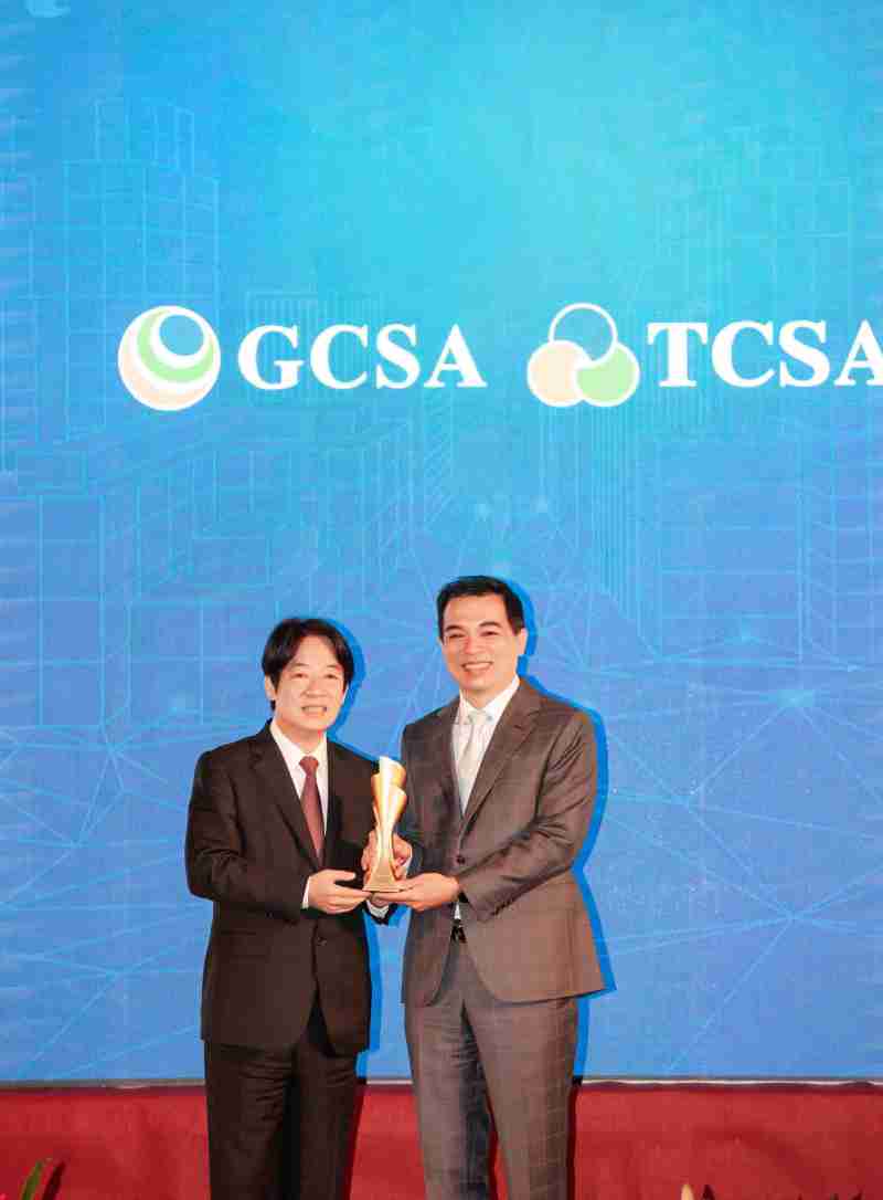 达全方位永续表现获全球永续奖及台湾永续奖肯定,,,由副总统赖清德颁奖 (左),,优游UB8总经理柯富仁 (右) 代表领奖
