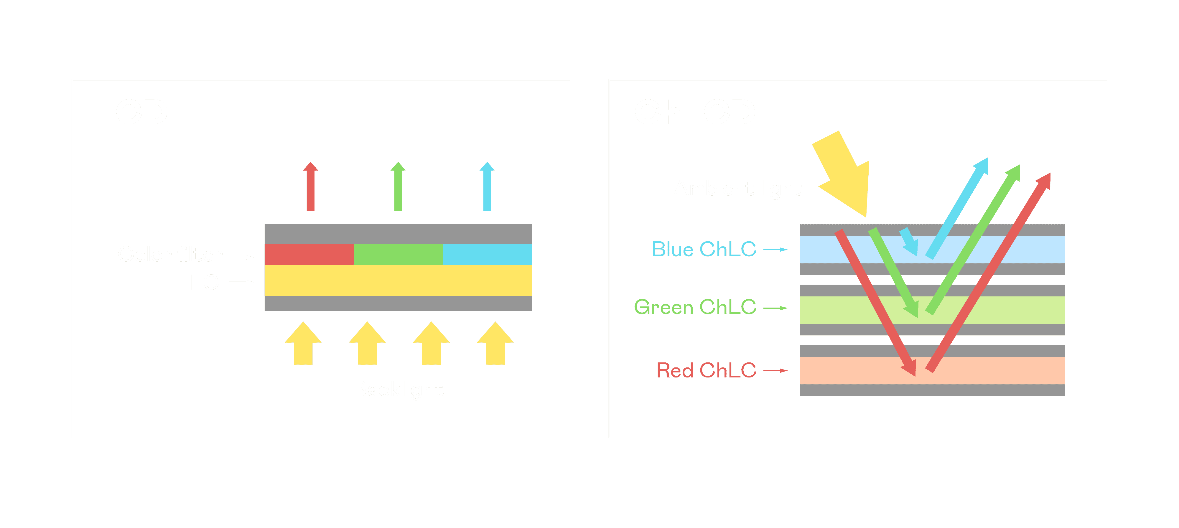 ChLCD 胆固醇液晶就如同纸张一样,,透过反射环境光来显示影像,,,因此长时间观看不易造成人眼视觉疲劳,,,可达到护眼效果。。。。当处于户外阳光下使用,,,LCD 影像容易失真而不易观看,,,,但胆固醇液晶仍可维持较佳的影像品质。。。。