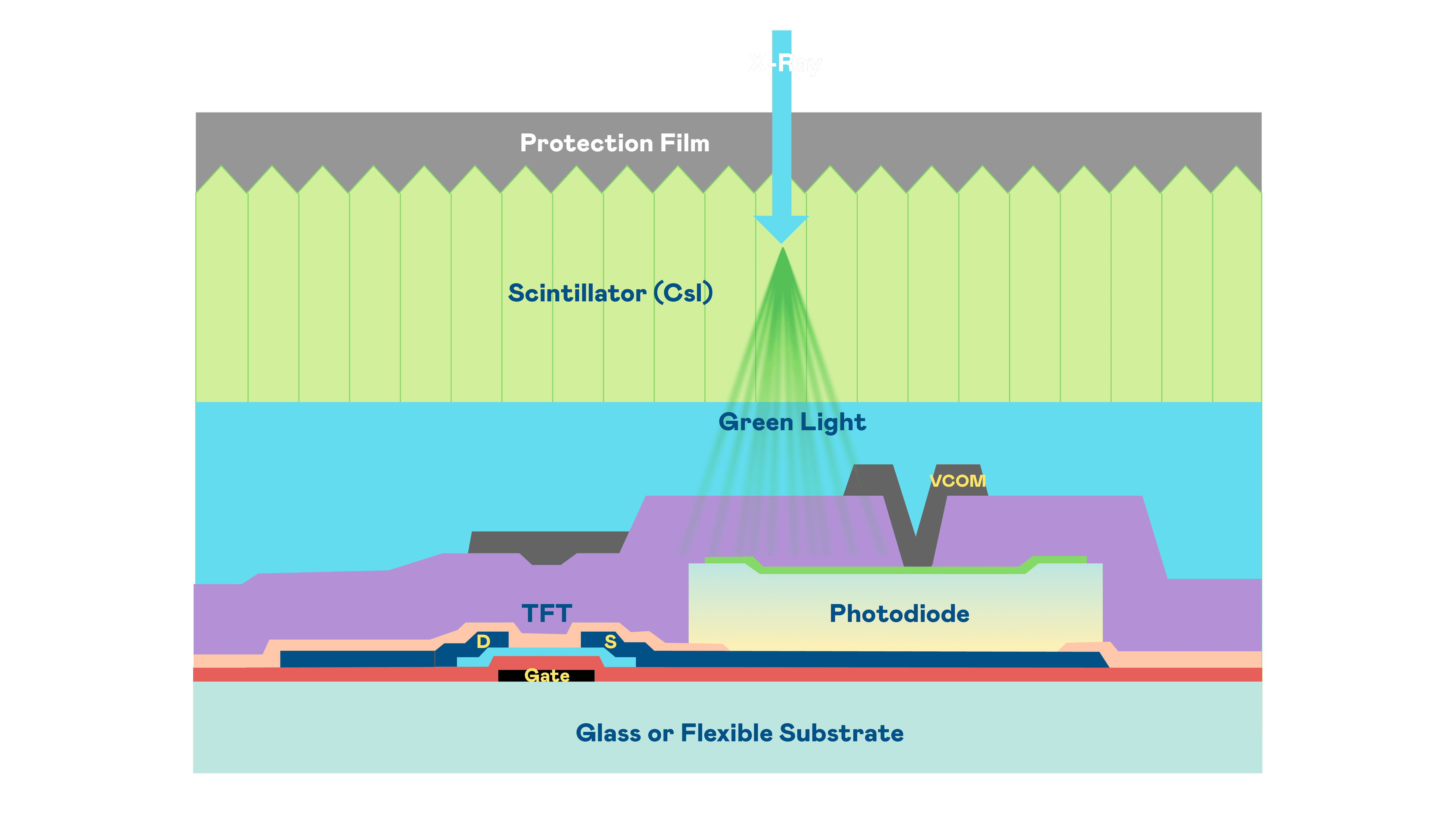 优游UB8的X光影像感测阵列使用薄膜电晶体 (TFT) 作为每个像素的读取开关,,搭配光电二极体(Photodiode)的光电转换元件,,,用以感测X光影像讯号。。。